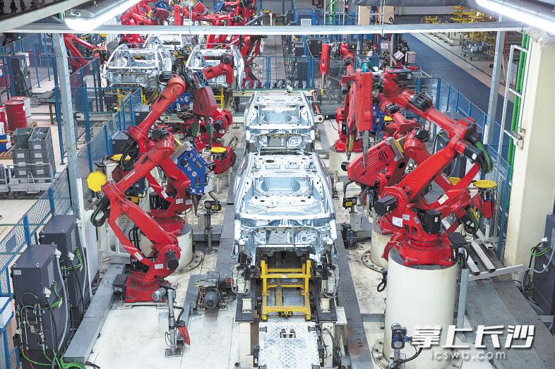 广汽菲克焊接车间内,机器人手臂在进行车体焊接。长沙晚报全媒体记者 王志伟 摄