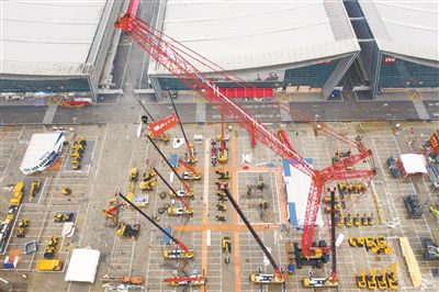 5月13日,长沙国际会展中心,三一集团参展的履带起重机耸立在半空中,气势雄伟。记者 唐俊 摄
