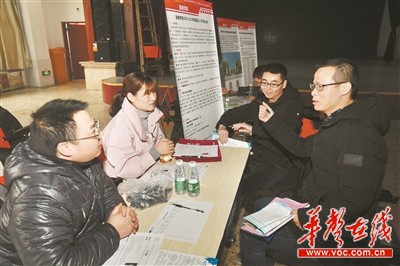 1月3日,2019年全国首场博士、博士后、海归人才暨高级人才巡回招聘会(长沙站)在中南大学校本部立功厅举行,几名研究生在用人单位展位前应聘。 湖南日报·华声在线记者 田超 摄