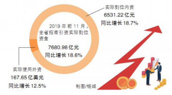 据统计,2019年前11月,全省招商引资实际到位资金7680.98亿元,同比增长18.6%。其中,实际使用外资167.65亿美元,同比增长12.5%;实际到位内资6531.22亿元,同比增长18.7%。全省新设外商投资企业232家,有资金到位的内联引资项目8390个。新金宝年产1300万台喷墨打印机、比亚迪电子智能终端制造、杉杉能源10万吨锂电动力电池材料、中电科8英寸集成电路等一批优质项目的竣工或投产,对加快我省产业升级、完善优势产业链、推动外贸追赶式跨越发展将起到极大的促进作用。
