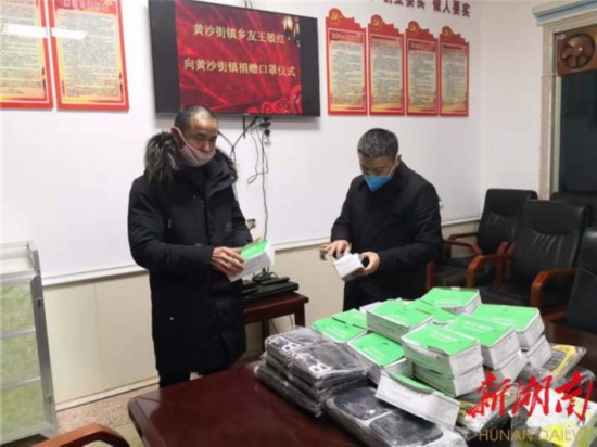 (岳阳县黄沙街镇大明村党员王敏红爱心捐赠2000只防护口罩。)