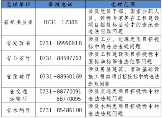 湖南省纪委昨日发布消息,经省委、省政府同意,省纪委监委等6单位决定于2020年4月至12月开展工程建设项目招投标突出问题专项整治。为充分发挥社会监督作用,6单位统一公布投诉举报电话,对群众举报反映的问题,将认真核实处置。(记者 李静)