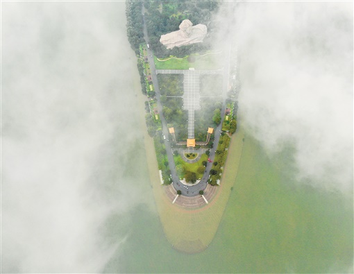 7月11日上午,长沙橘子洲景区,洪水淹没亲水平台。据长沙市水文局消息,当天6时07分,湘江长沙水文站出现洪峰,洪峰水位35.95米,距警戒水位仅0.05米。目前水位逐步回落。受洞庭湖顶托影响,预计未来一周湘江长沙段水位仍将维持在35米以上。记者 辜鹏博 摄