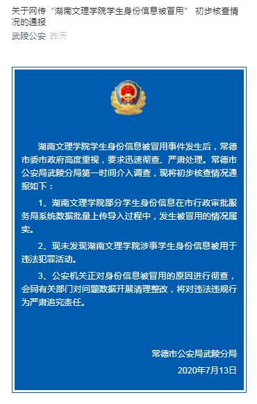 通报称,湖南文理学院学生身份信息被冒用事件发生后,常德市委市政府高度重视,要求迅速彻查、严肃处理。常德市公安局武陵分局第一时间介入调查。