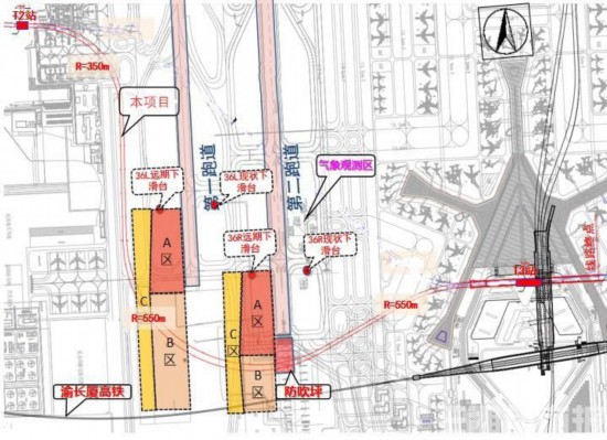 的曲线折向南,沿机场围墙外走行,之后在机场第一跑道南端避开第一跑道、滑行道及远期下滑台保护区 B、C 区,之后以半径为 550m 曲线折向东,避开第二跑道,下穿防吹坪,与渝长厦高铁最小结构净距约为 44m,之后以半径为 550m 曲线接入 T3 站。