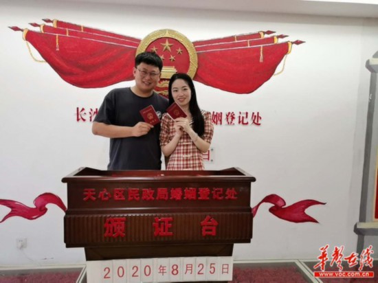 (8月25日,在长沙市天心区民政局婚姻登记处,一对新人正在颁证台上留影。实习生 雷其荣 记者 杨昱 摄)