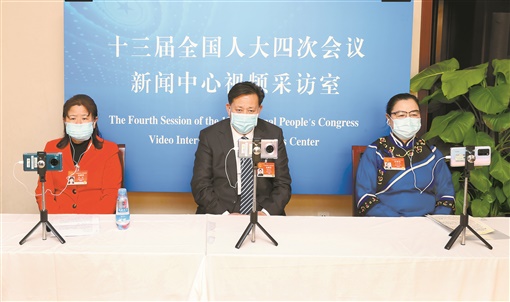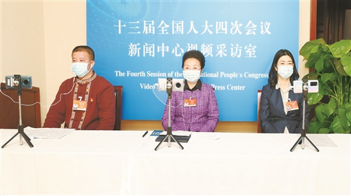 图为谭泽勇、龙晓华、李小红(从左至右)3位代表通过视频连线,接受记者采访。 湖南日报·华声在线记者 赵持 刘尚文 摄