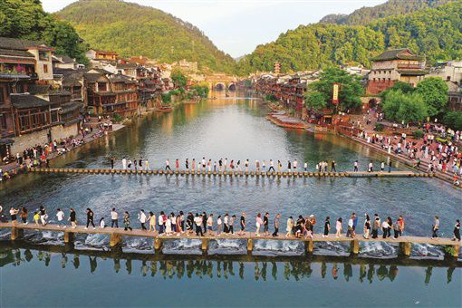 凤凰古城沱江河畔风景如画,游人如织。记者 郭立亮 摄