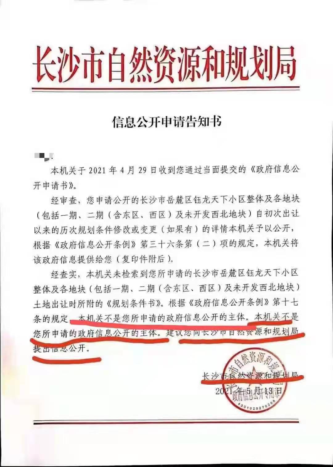 5月15日上午,网上流传一份盖有“长沙市自然资源和规划局政府信息公开专用章”的《政府信息公开告知书》,其中出现了“本机关不是您所申请的政府信息公开的主体,建议您向长沙市自然资源和规划局申请信息公开”的不恰当表述,并且出现文字重复、把关不严的问题,引发了社会的关注和质疑。