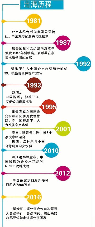 从越南的湄公河畔、印尼的苏门答腊岛、巴基斯坦的印度河平原、尼日利亚的丘陵河谷地带……杂交水稻已经推广种植和引进试种到数十个国家和地区,海外种植面积达700万公顷。袁隆平曾说,全世界有一亿六千万公顷的稻田,如果其中有一半稻田是杂交稻,每公顷增产两吨算,可以增产一亿六千万吨粮食,可以多养四到五亿人。
