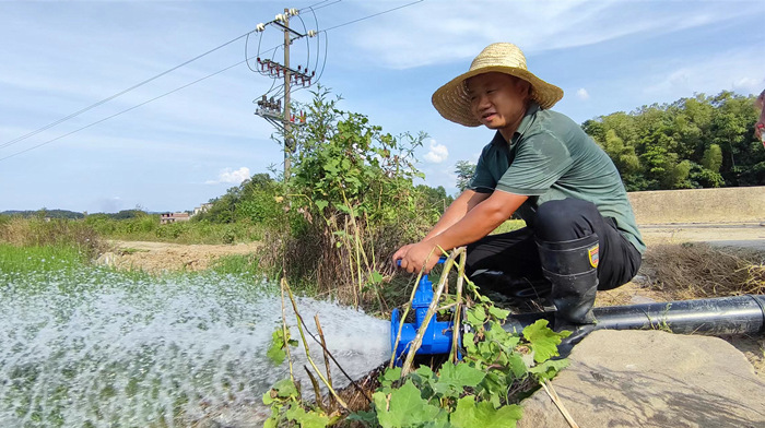 隆昌晓随即买来柴油抽水机,开始从稻田旁的小溪抽水抗旱。