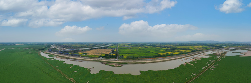 洞庭湖里,水退去后裸露出青青洲滩,浅水湾中有成群的夏候鸟驻足停留、捉鱼吃虫,白茫茫一片尽收眼底。岸上是黄绿相间的沃野田畴,湖盆星星点点藏于其间,河汊弯弯绕绕犹如少女的辫子,交织着丰收的希望。
