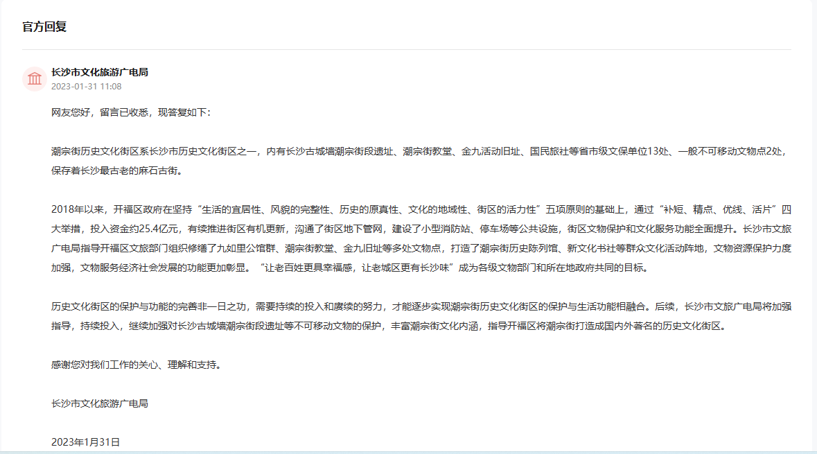 长沙市文化旅游广电局表示,2018年以来,开福区政府在坚持“生活的宜居性、风貌的完整性、历史的原真性、文化的地域性、街区的活力性”五项原则的基础上,通过“补短、精点、优线、活片”四大举措,投入资金约25.4亿元,有续推进街区有机更新,沟通了街区地下管网,建设了小型消防站、停车场等公共设施,街区文物保护和文化服务功能全面提升。