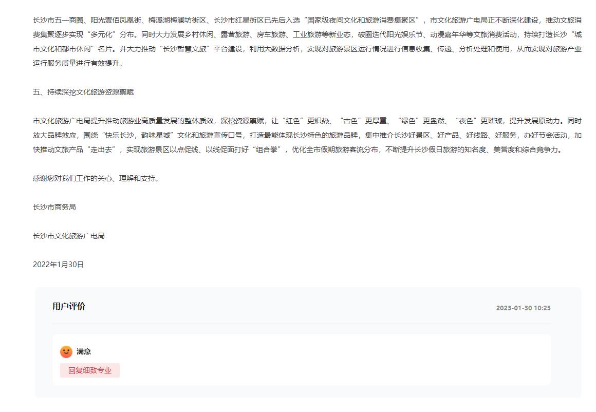 据回复称,市文化旅游广电局还将提升推动旅游业高质量发展的整体质效,深挖文化旅游资源禀赋。围绕“快乐长沙,韵味星城”文化和旅游宣传口号,打造最能体现长沙特色的旅游品牌,加快推动文旅产品“走出去”,实现旅游景区以点促线、以线促面打好“组合拳”,优化全市假期旅游客流分布,不断提升长沙假日旅游的知名度、美誉度和综合竞争力。