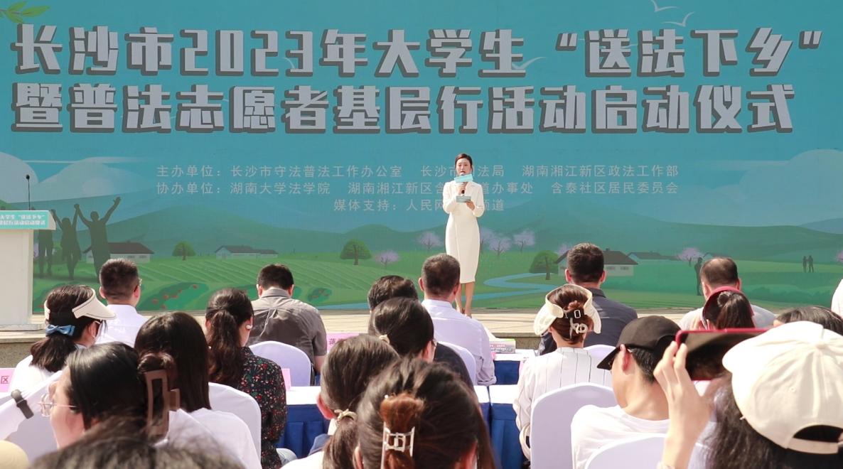 6月21日上午,长沙市守法普法工作办公室、长沙市司法局、湖南湘江新区政法工作部主办的长沙市2023年大学生“送法下乡”暨普法志愿者基层行活动在湘江新区含浦街道含泰社区君子文化广场举行。