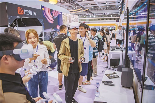 7月11日,湖南国际会展中心,观众在2023中国新媒体技术展上参观体验。