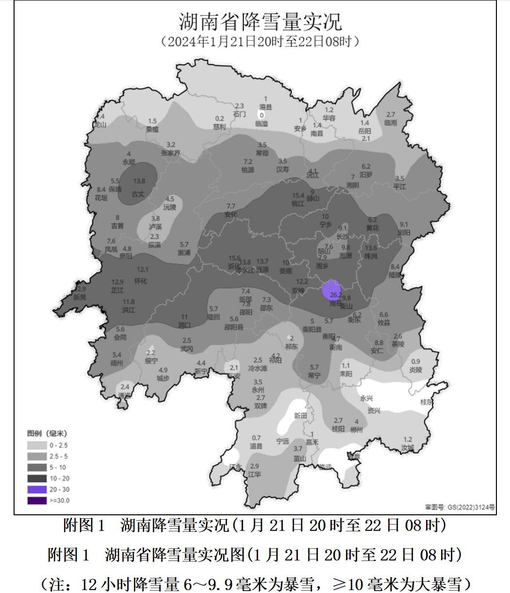 根据观测数据显示:1月21日20时至1月22日08时,湘北、湘中出现中到大雪,其中湘西州南部、怀化中部、邵阳北部、娄底、益阳南部、长沙、常德南部、岳阳南部、湘潭等出现暴雪到大暴雪,其中新化、桃江特大暴雪,83个县市区出现积雪。