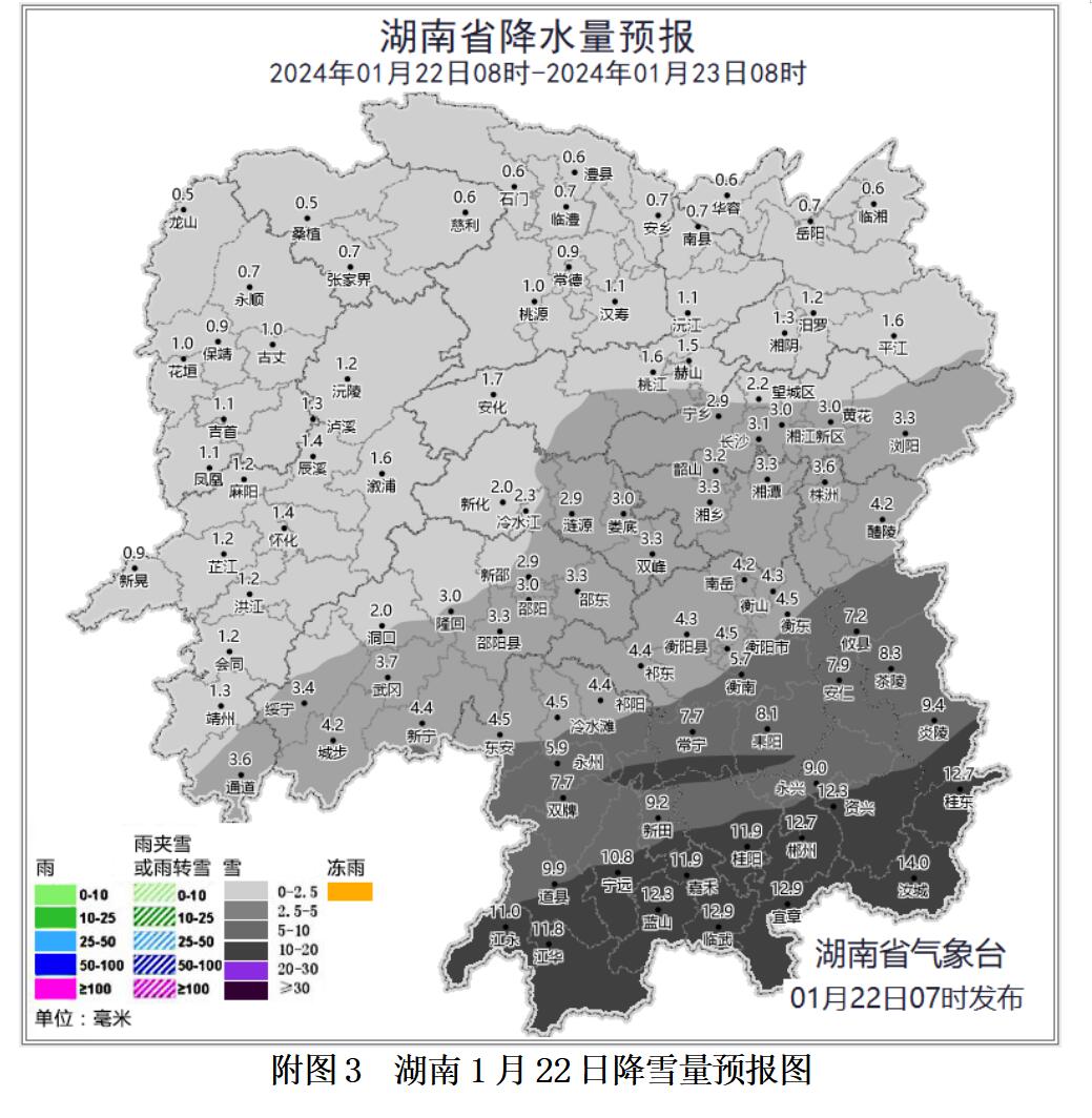 今天白天到晚上,湘南阴天有中到大雪,其中永州、郴州、衡阳南部、株洲南部有暴雪,其他地区小到中雪转多云(附图3);北风4~5级;最高气温1~3℃;最低气温湘西、湘北-6~-4℃,其他地区-4~-2℃。