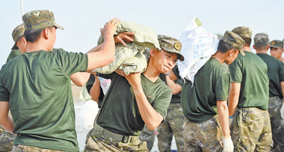 7月8日,湖南岳阳市华容县团洲垸洞庭湖大堤,武警官兵在搬运砂石。本报记者 陈 斌摄