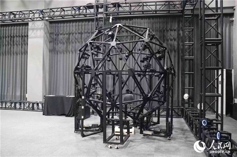 光场棚内,一个球型的镂空装置密密麻麻布满了摄像机。“这是LuStage光场重建系统,使用的是最新一代4K高速光学相机和自研算法,能实现0.1mm毛孔级重建。人只需坐在里面,十几分钟左右就可以制作出一个可以360度查看的全身三维模型。”马栏山凌云光相关负责人说。