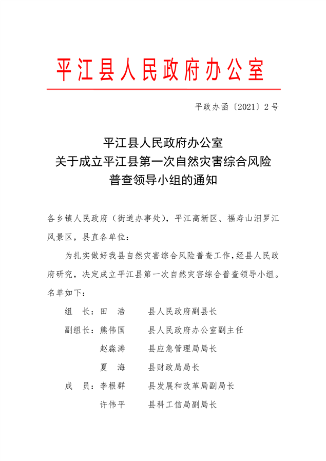 关于成立平江县第一次自然灾害综合风险普查领导小组的通知