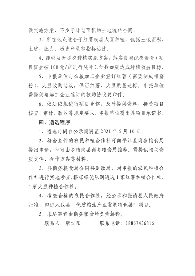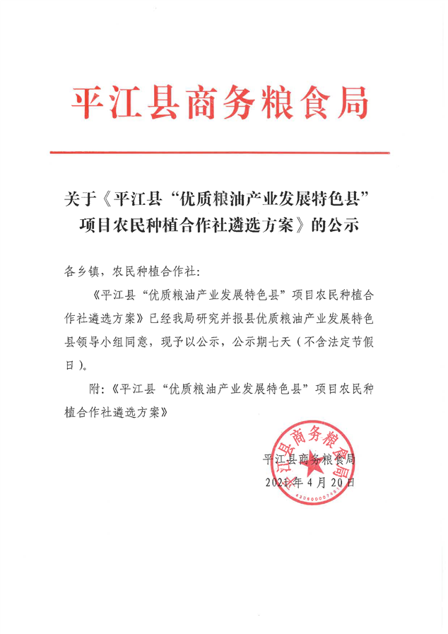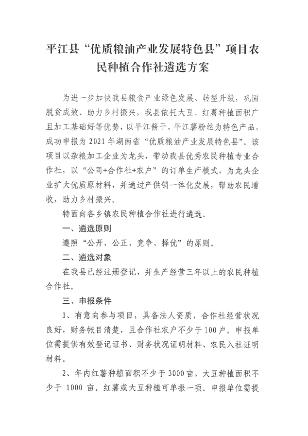 关于《平江县“优质粮油产业发展特色县”项目农民种植合作社遴选方案》的公告