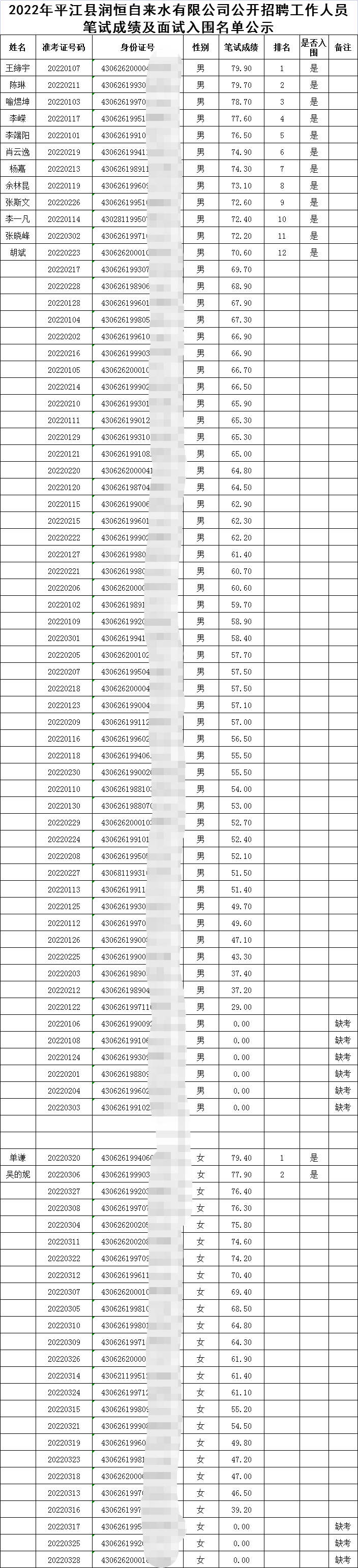 2022年平江县润恒自来水有限公司公开招聘工作人员 笔试成绩及面试入围名单公示