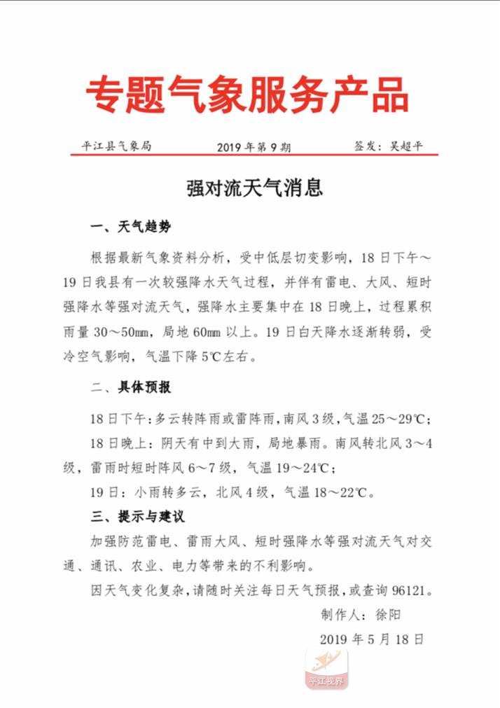 据省市县气象部门最新分析,受中低层切变影响,18日下午~19日我县有一次较强降水天气过程,并伴有雷电、大风、短时强降水等强对流天气,强降水主要集中在18日晚上,过程累积雨量30~50mm,局地60mm以上。