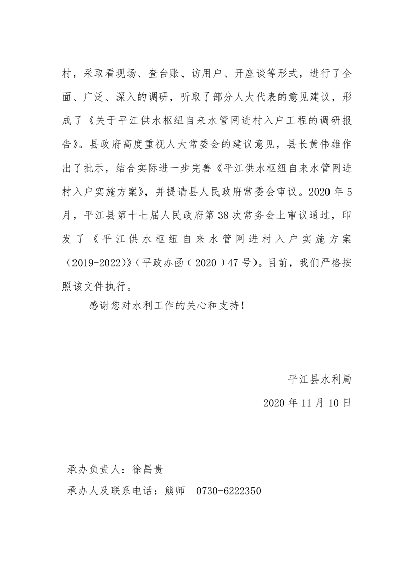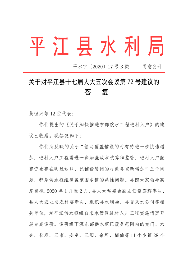 关于对平江县十七届人大五次会议第72号建议的答复