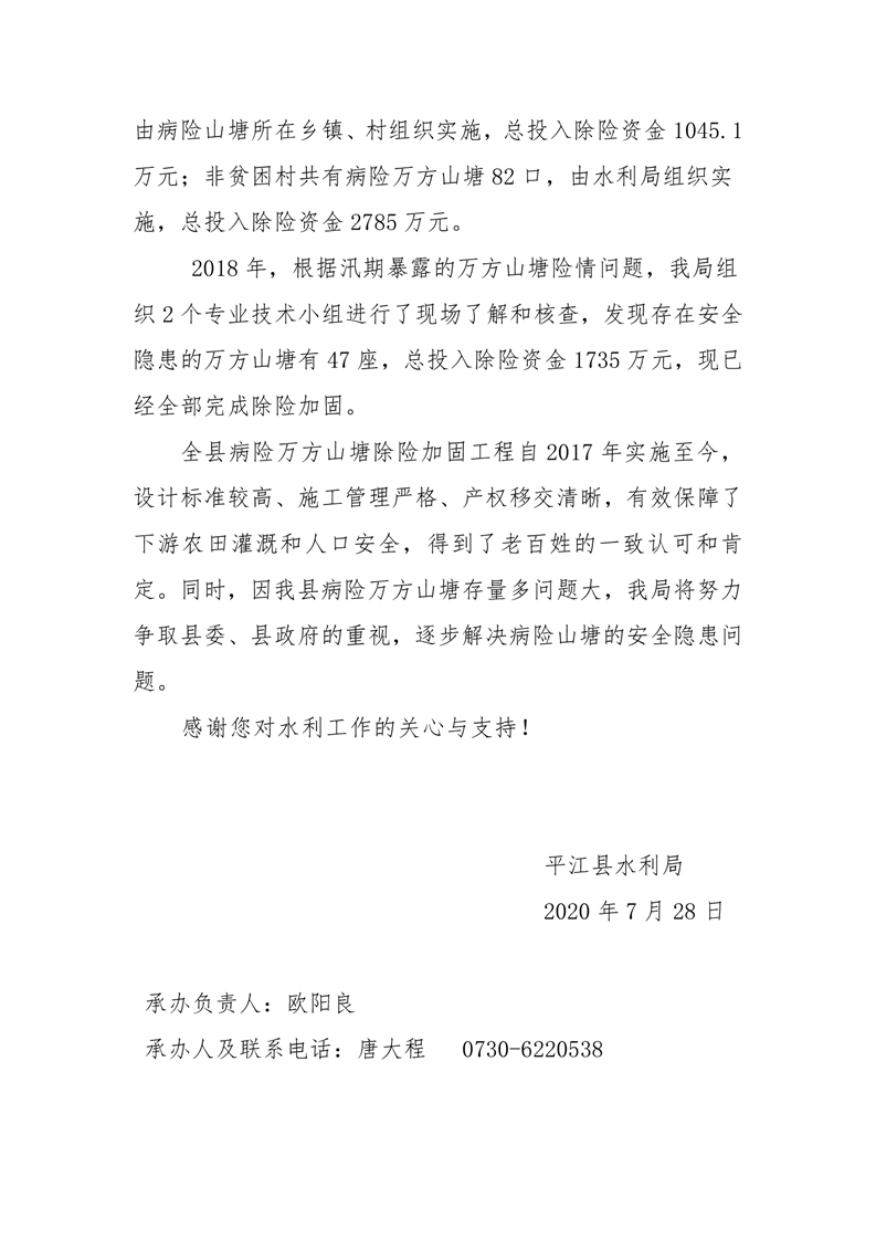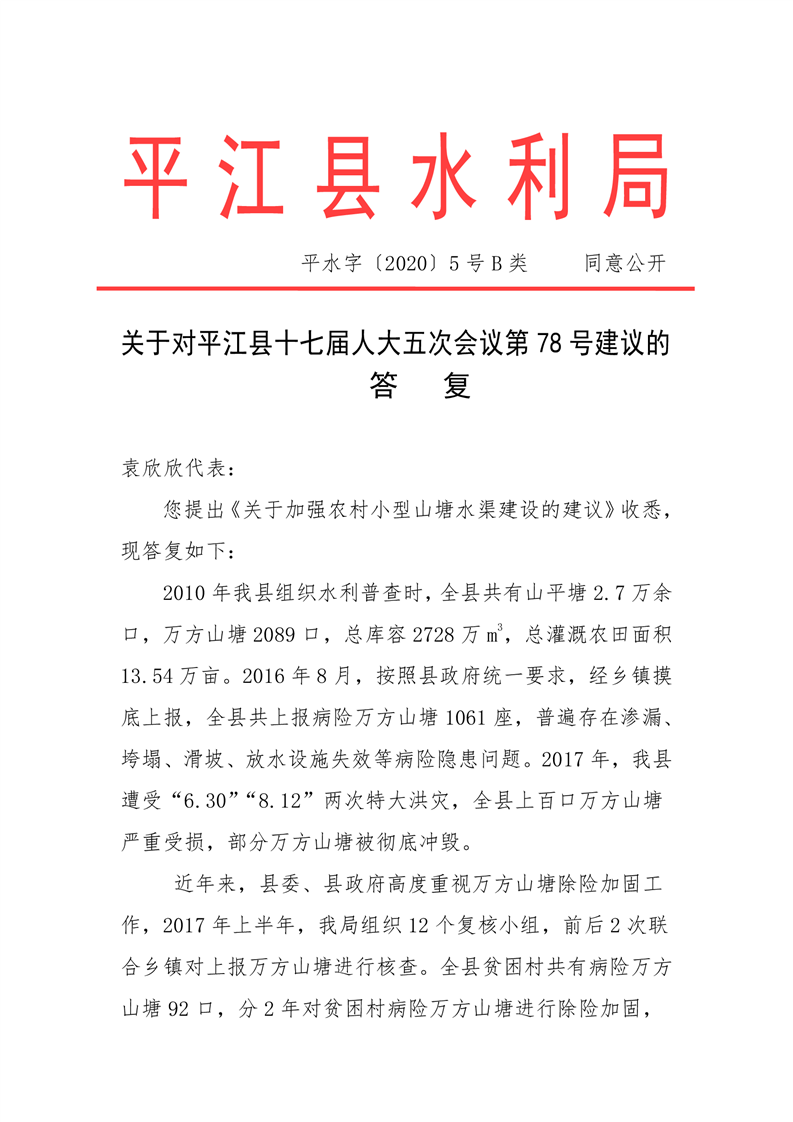 关于对平江县十七届人大五次会议第78号建议的答复