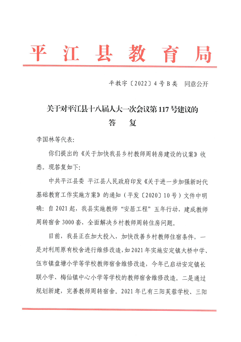 关于对平江县十八届人大一次会议第117号建议的答复