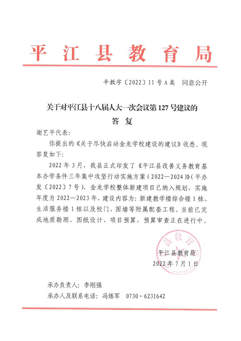 关于对平江县十八届人大一次会议第127号建议的答复