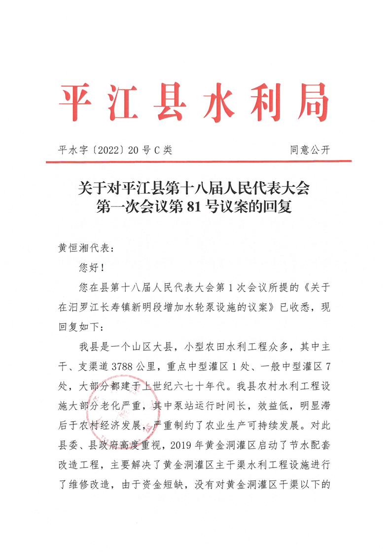 关于对平江县十八届人大一次会议第81号议案的回复