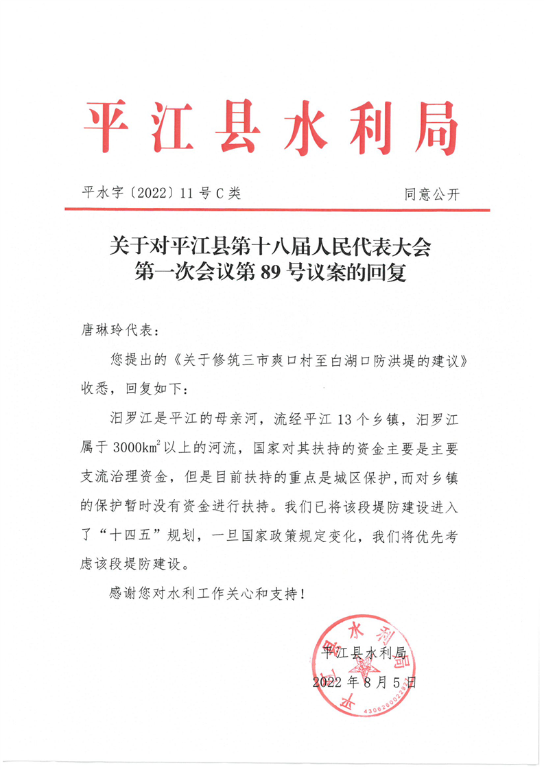 关于对平江县十八届人大一次会议第89号议案的回复