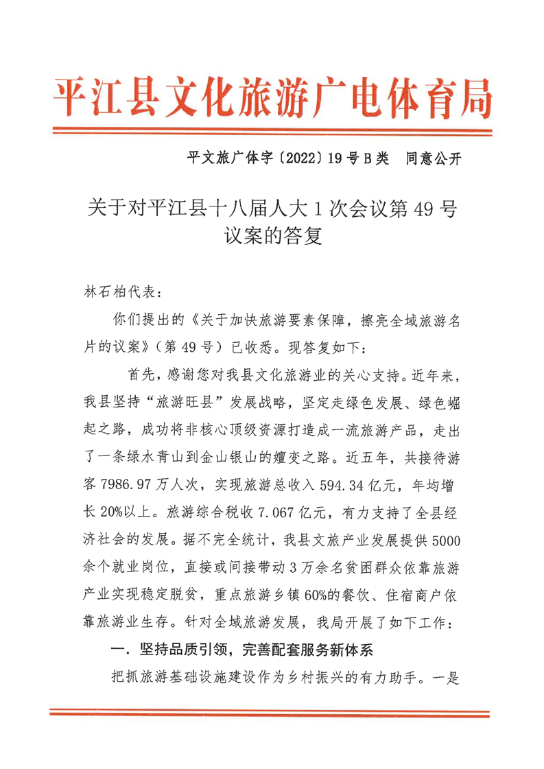 关于对平江县十八届人大一次会议第49号议案的回复