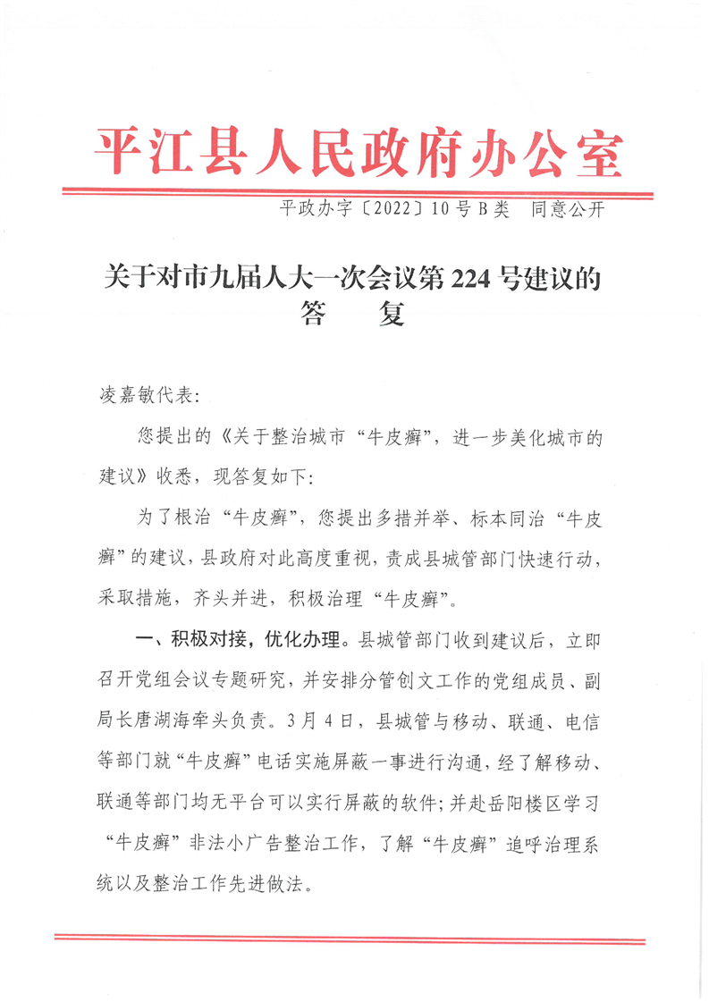 关于对市九届人大一次会议第224号建议的答复