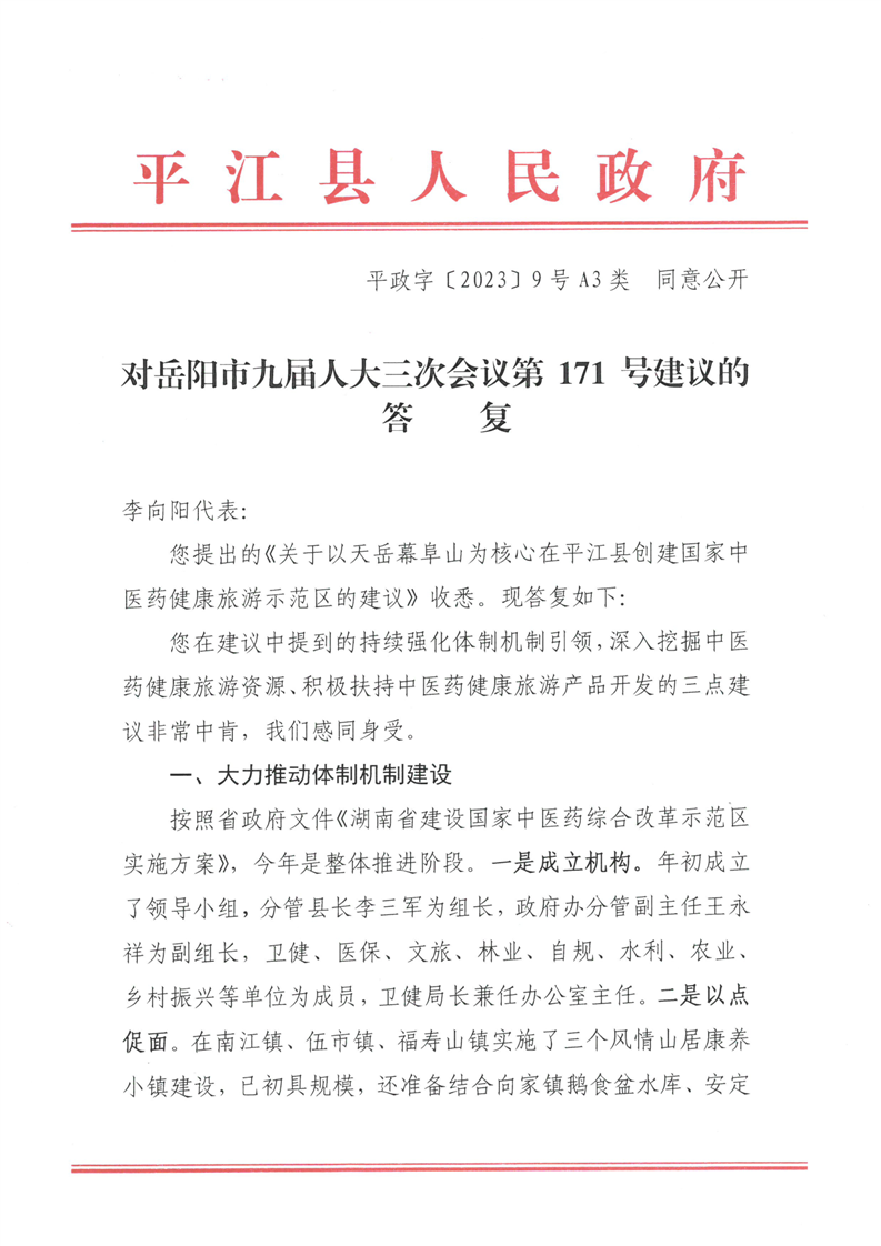 平政字[2023]9号对岳阳市九届人大三次会议第171号建议的答复