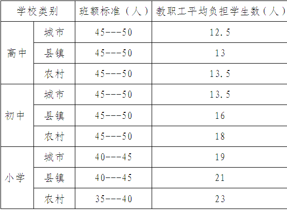 ①统一编制标准,促进城乡中小学教育资源均衡配置。根据中央关于推进城乡发展一体化和基本公共服务均等化精神,在遵循《国务院办公厅转发中央编办、教育部、财政部关于制定中小学教职工编制标准意见的通知》(国办发〔2001〕74号)和《关于进一步落实<国务院办公厅转发中央编办、教育部、财政部关于制定中小学教职工编制标准意见的通知>有关问题的通知》(中央编办发[2009]6号)关于核定中小学教职工编制原则和有关工作要求的基础上,将县镇、农村中小学教职工编制标准统一到城市标准,即高中教职工与学生比为1:12.5、初中为1:13.5、小学为1:19。