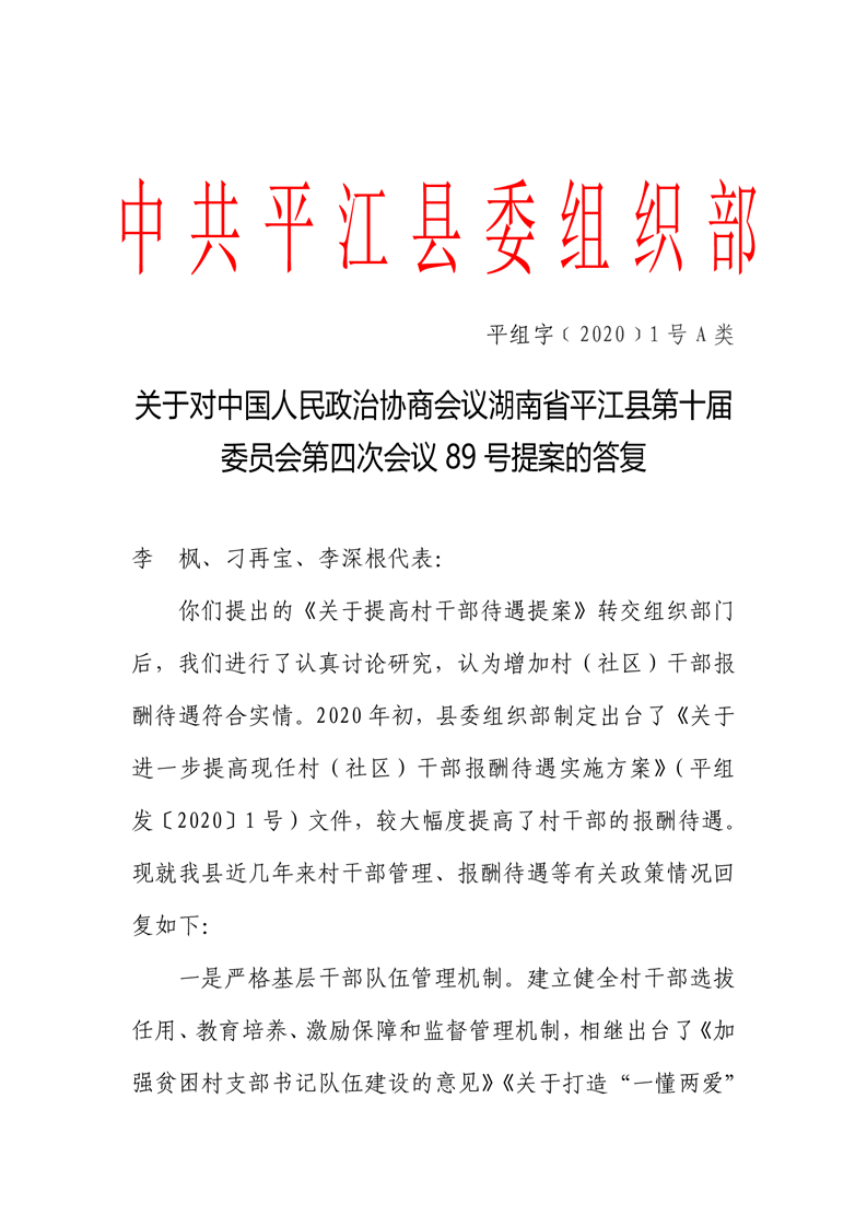 关于对中国人民政治协商会议湖南省平江县第十届委员会第四次会议89号提案的答复