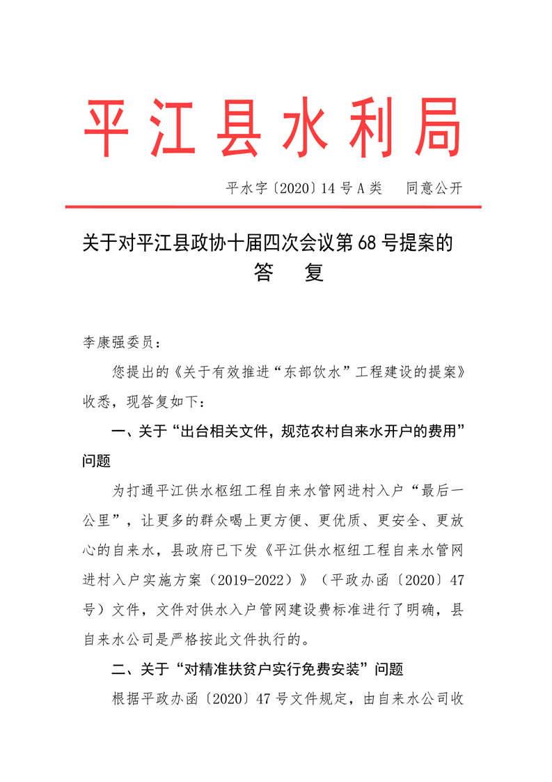 关于对平江县政协十届四次会议第68号提案的答复
