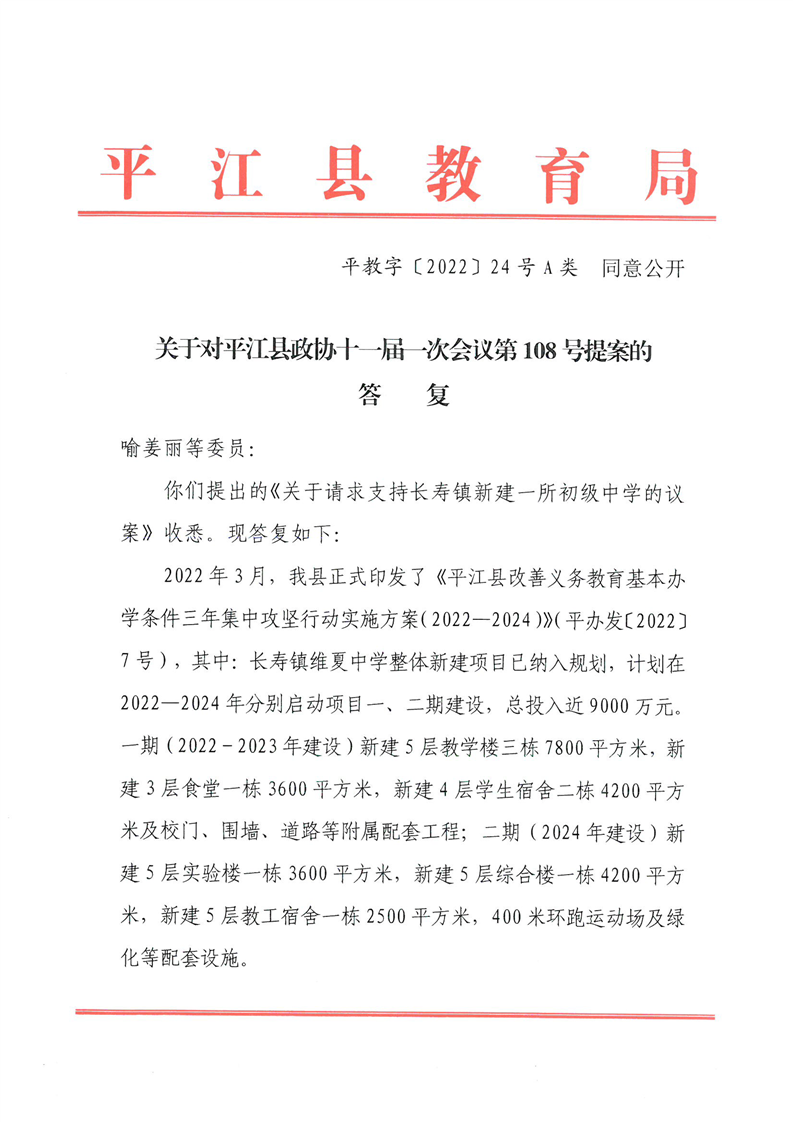 关于对平江县政协十一届一次会议第108号提案的答复