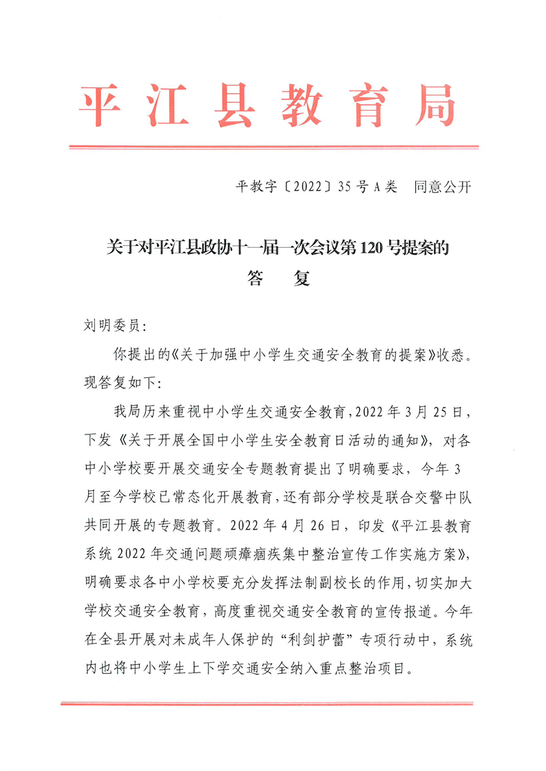 关于对平江县政协十一届一次会议第120号提案的答复