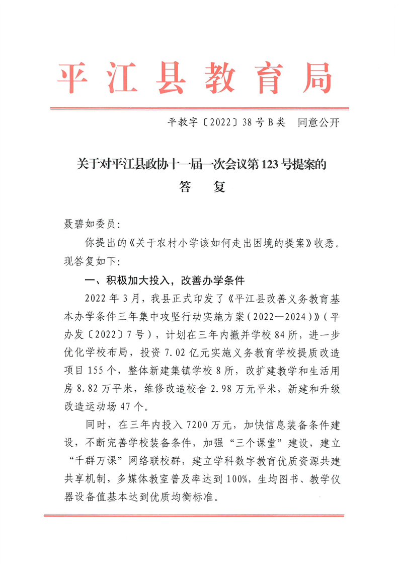 关于对平江县政协十一届一次会议第123号提案的答复