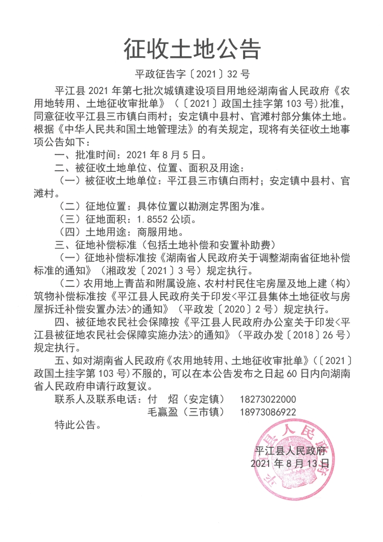 平江县2021年第七批次城镇建设项目征收土地公告