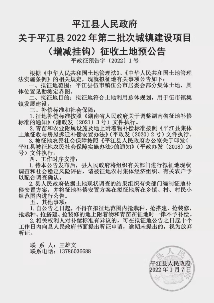 平江县2022年第二批次城镇建设项目征收土地预公告