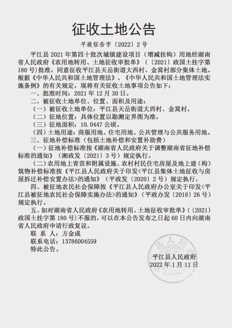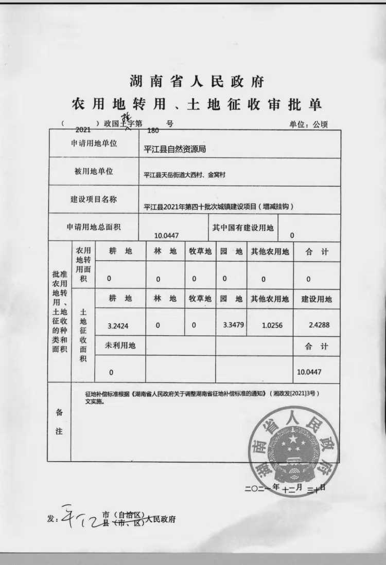 平江县2021年第四十批次城镇建设项目征收土地公告