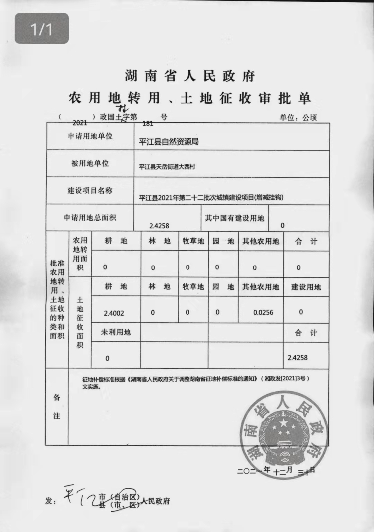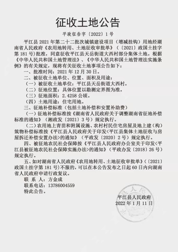 平江县2021年第二十二批次城镇建设项目征收土地公告