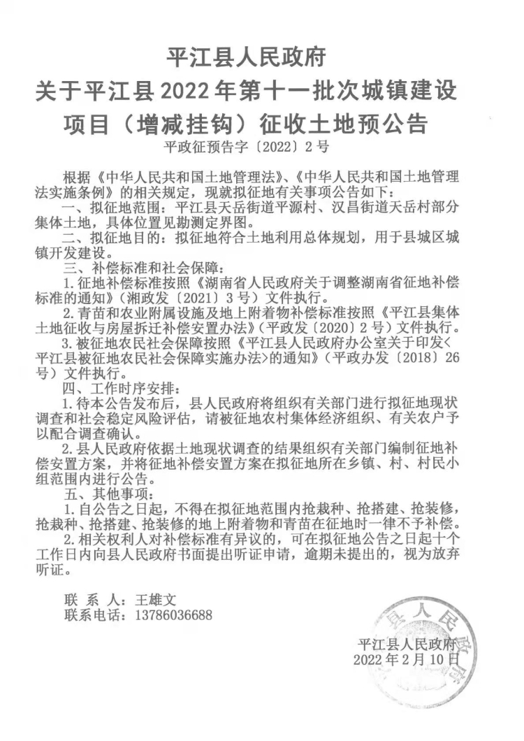 平江县2022年第十一批次城镇建设项目征收土地预公告