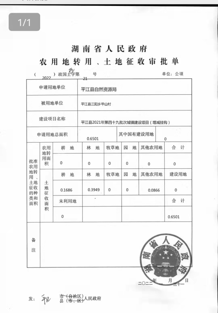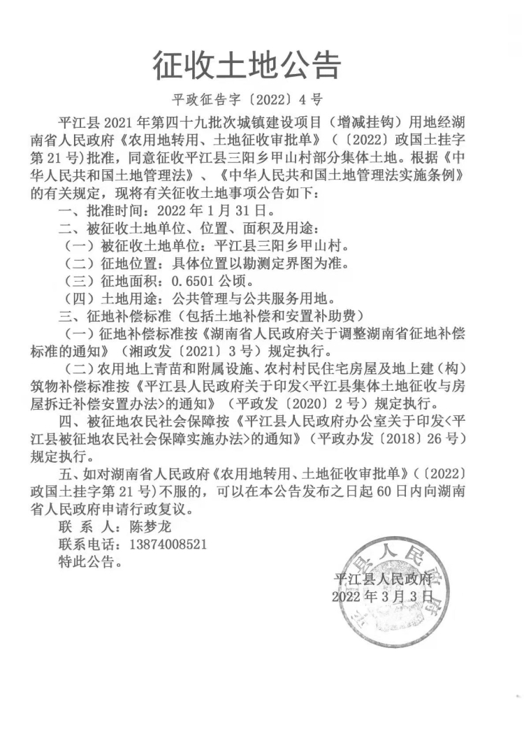 平江县2021年第四十九批次城镇建设项目征收土地公告