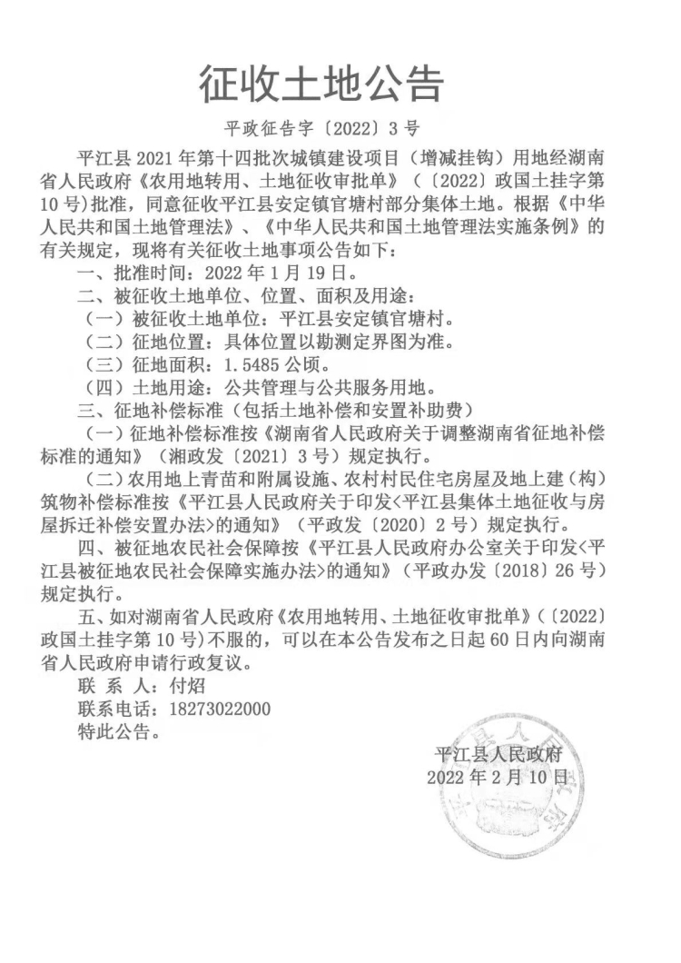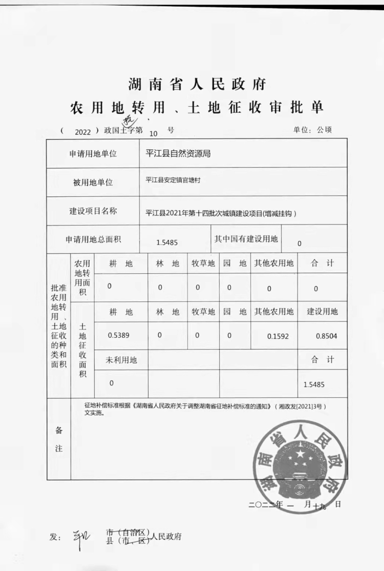平江县2021年第十四批次城镇建设项目征收土地公告